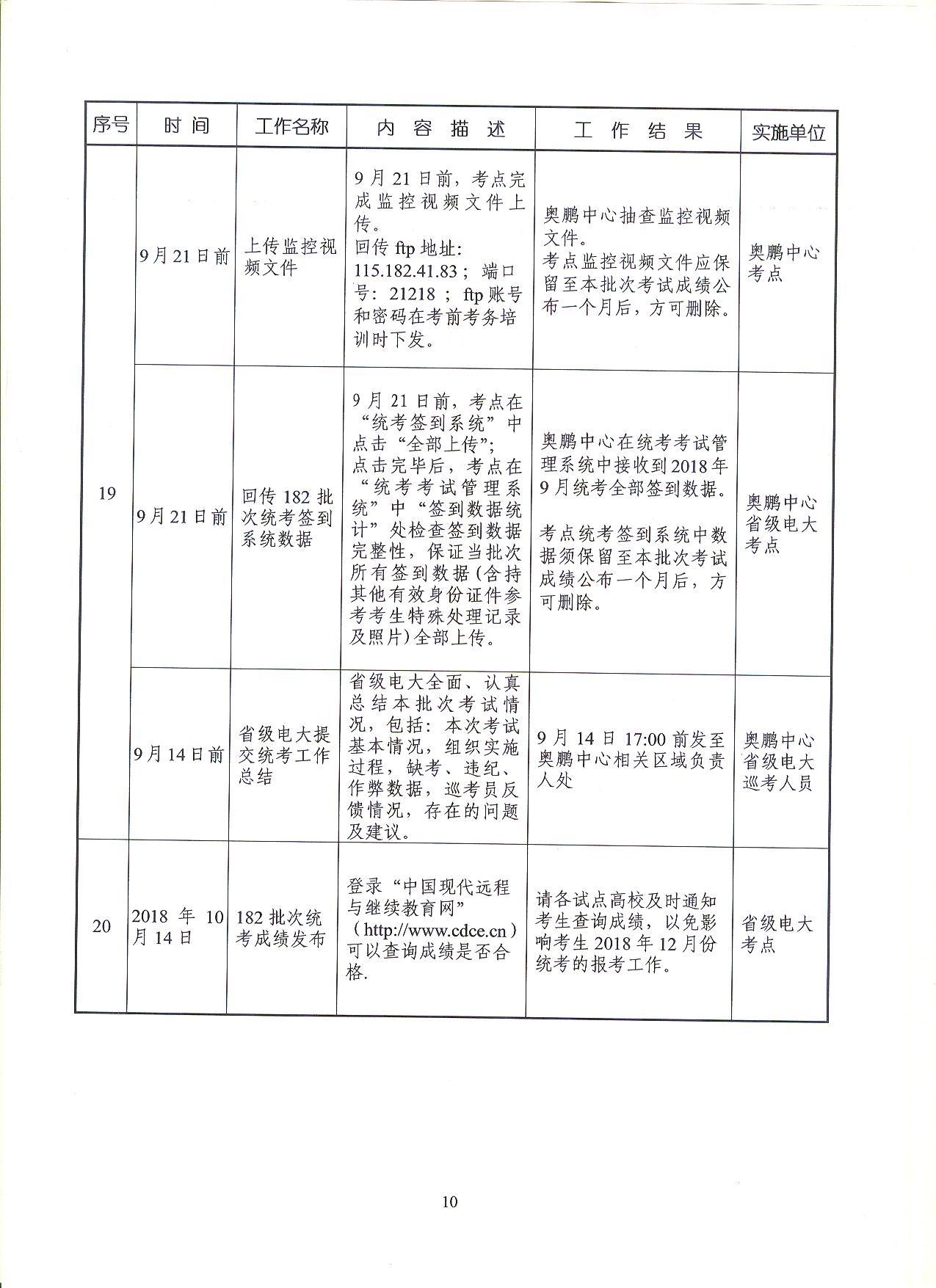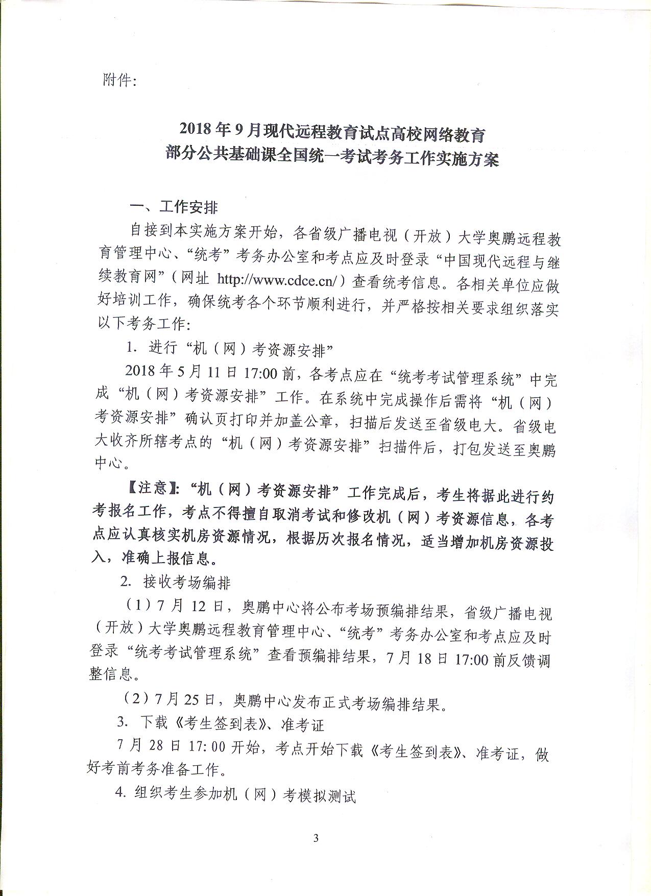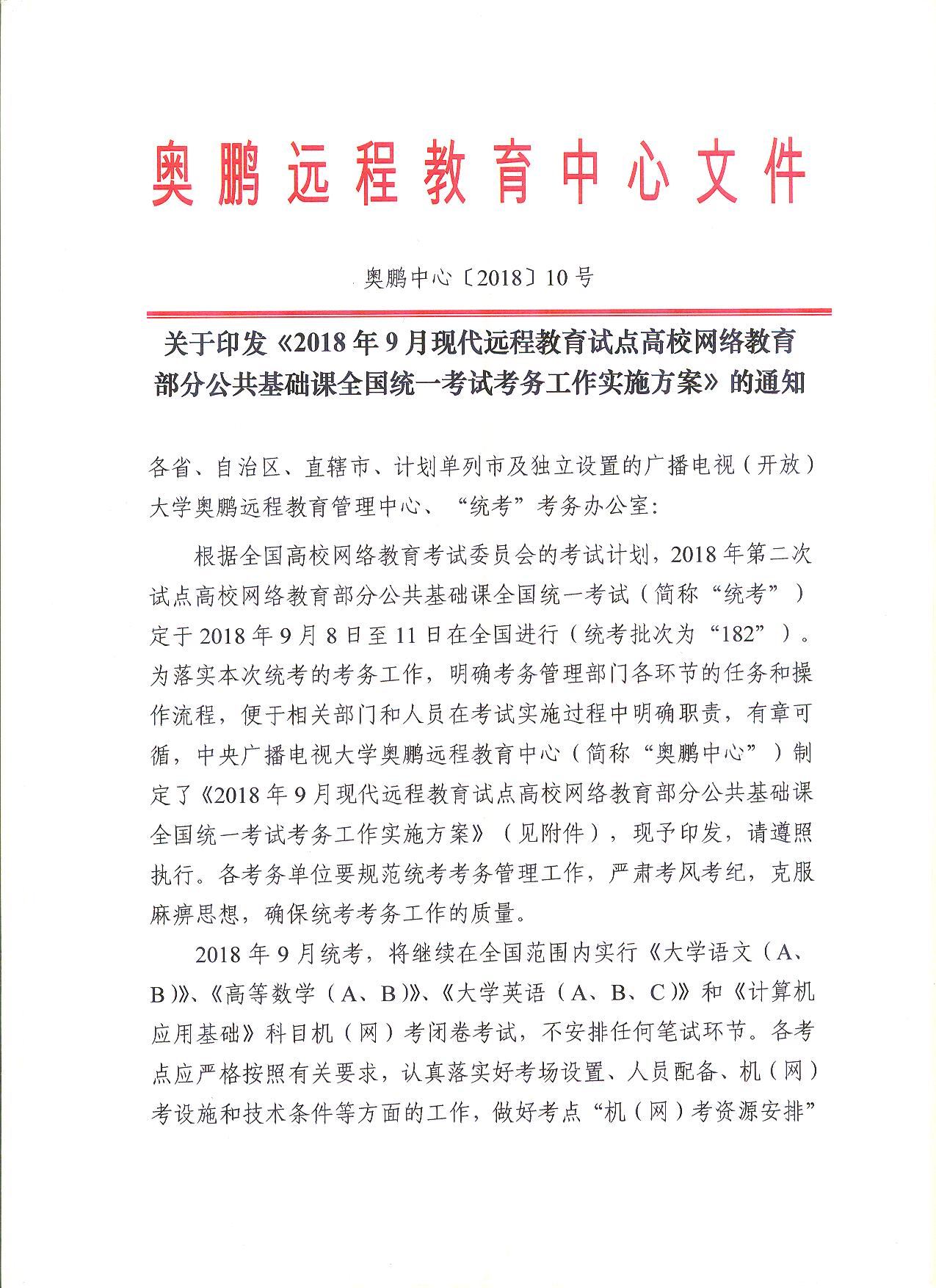 2018年9月现代远程教育试点高校网络教育部分公共基础课全国统一考试考务工作实施方案